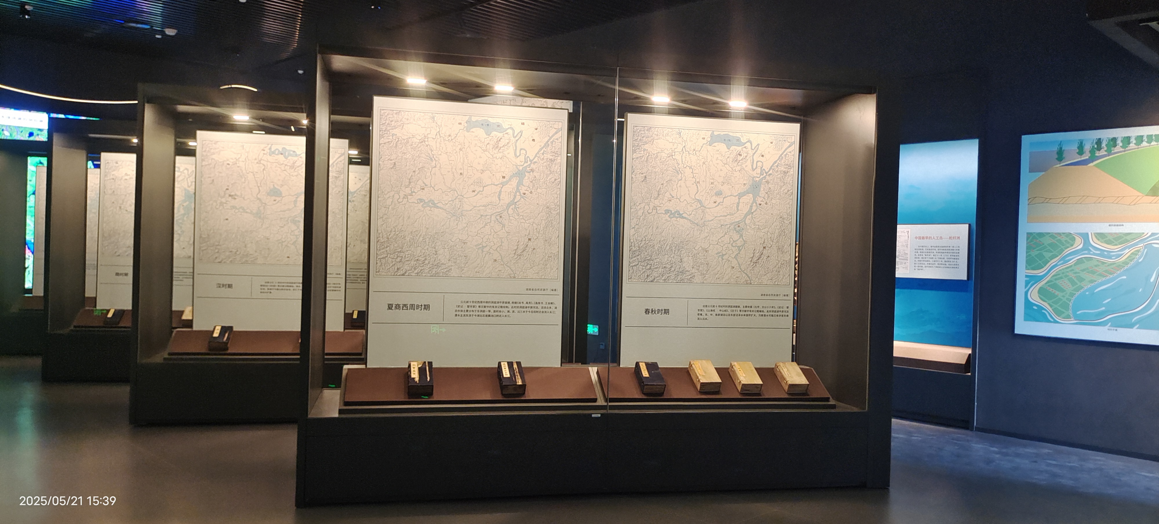 衔远山吞长江:讲述洞庭湖水系特点、洪水成因,以及水域面积、水位的历史变迁。其中有很多小故事,包括洞庭湖的水系、洞庭湖洪水、水文变化、堤垸文化、湖区特色舟船,舵杆洲故事等信息,同时展示了专业单位捐赠的水文、航道、气象仪器等展品,复制的里耶秦简,以及最早的洞庭湖科学测绘地图(清末)等。