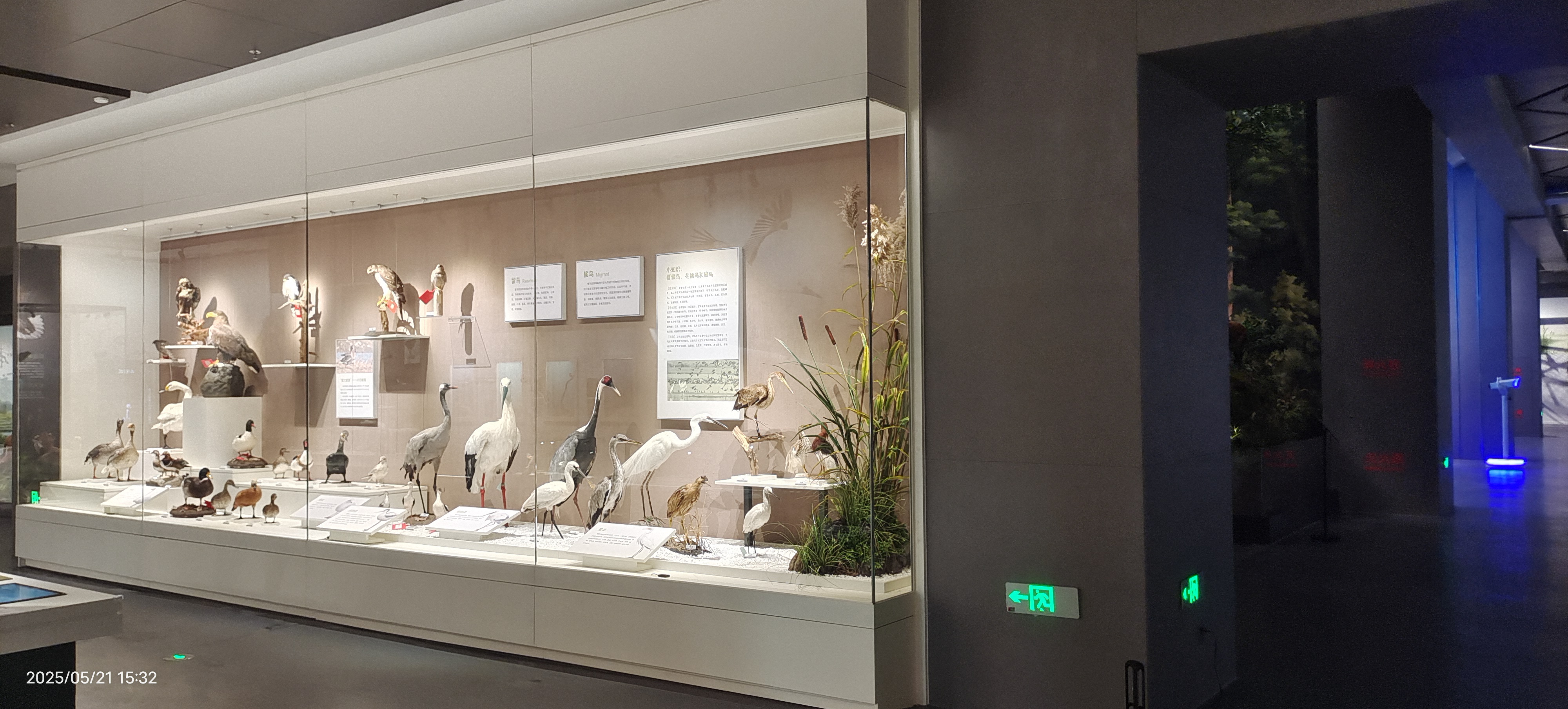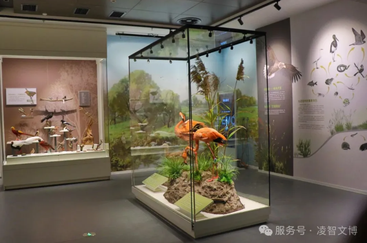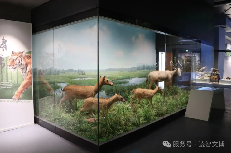全景生态缸搭载温湿度传感系统,麋鹿标本与活体湿地植物共栖,玻璃面雾化技术模拟洞庭晨雾,再现“沙鸥翔集”生境。